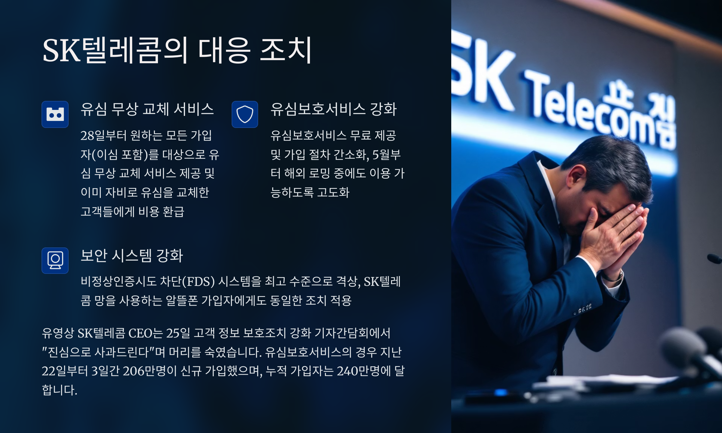 유영상 SK텔레콤 CEO는 25일 고객 정보 보호조치 강화 기자간담회에서 "진심으로 사과드린다"며 머리를 숙였어요. SK텔레콤은 피해 고객들을 위해 다음과 같은 조치를 발표했어요