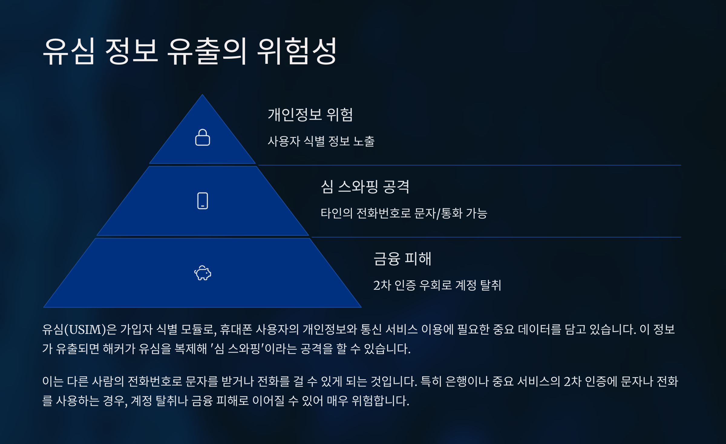 이 정보가 유출되면 해커가 유심을 복제해 '심 스와핑'이라는 공격을 할 수 있는데, 이는 다른 사람의 전화번호로 문자를 받거나 전화를 걸 수 있게 되는 것이죠. 특히 은행이나 중요 서비스의 2차 인증에 문자나 전화를 사용하는 경우, 계정 탈취나 금융 피해로 이어질 수 있어 매우 위험해요.