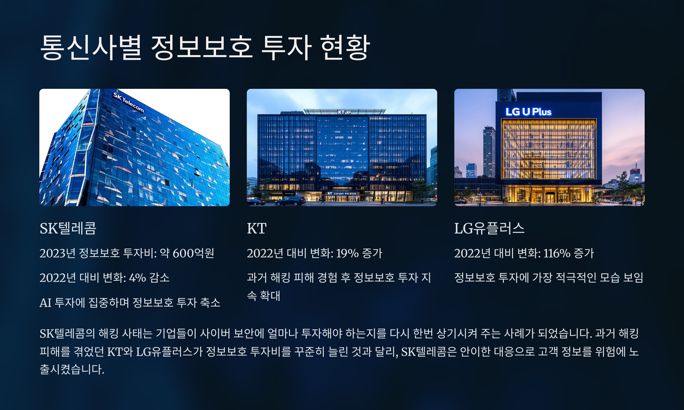 SK텔레콤의 해킹 사태는 기업들이 사이버 보안에 얼마나 투자해야 하는지를 다시 한번 상기시켜 주는 사례가 되었어요. 과거 해킹 피해를 겪었던 KT와 LG유플러스가 정보보호 투자비를 꾸준히 늘린 것과 달리, SK텔레콤은 안이한 대응으로 고객 정보를 위험에 노출시켰죠.