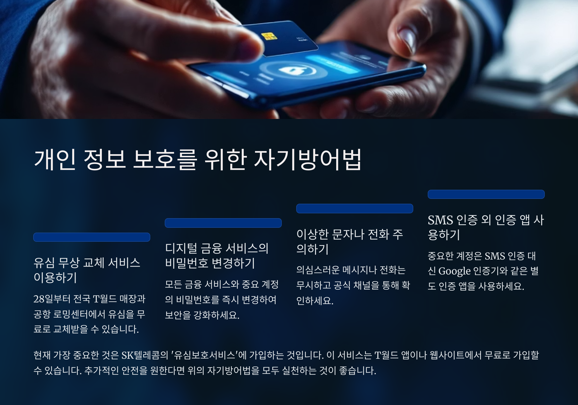 현재 가장 중요한 것은 SK텔레콤의 '유심보호서비스'에 가입하는 것이에요. 이 서비스는 T월드 앱이나 웹사이트에서 무료로 가입할 수 있어요. 추가적인 안전을 원한다면 28일부터 전국 T월드 매장과 공항 로밍센터에서 유심을 무료로 교체받을 수 있어요.